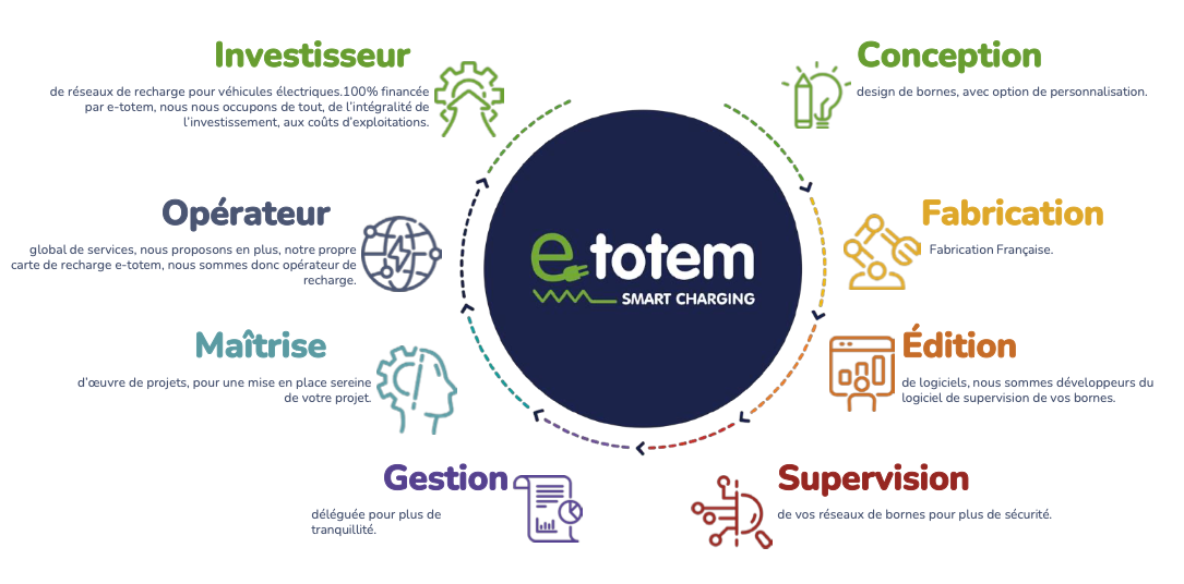 e-Totem est une société française indépendante spécialiste de la recharge de véhicules électriques de 2 à 400 kW. Depuis 2012, elle développe un concept clé en main de bornes de recharge pour les professionnels et collectivités.